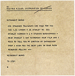 日付は英国式だとすれば1968年9月4日でしょうか。内容は「親愛なるスタンリー。昨日あなたの映画を見たときの気持ちと感激を伝えたい。これからも素晴らしい映画を作ってください。」と簡単なものですが、観た翌日に電報で送っているあたり、よっぽど感激したのでしょう。イタリアでの公開は1968年12月と遅かったので、どこか他の国で観たものと考えられます。