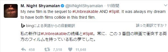 重大発表とは、「アンブレイカブル」と「スプリット」の続編映画「GLASS」を製作するとの事でした。