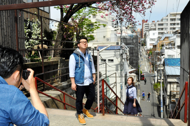 東京都新宿区の須賀神社で、映画「君の名は。」のポスターと同じようなポーズで写真を撮ってもらうマカオのカップル